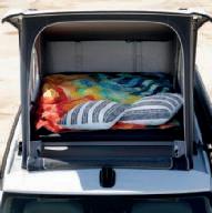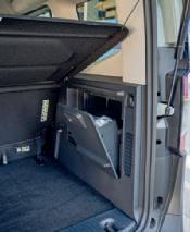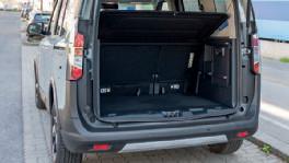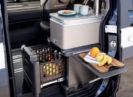 Beach Camper: Wie der Beach Tour ist er ein Fünfsitzer, aber zusätzlich mit einer äußerst kompakt gebauten Miniküche und einem 230-Volt-Landstrom-Anschluss ausgestattet. Die Küche mit Einflammen-Gaskocher, einer Besteckschublade und weiterem Stauraum befindet sich in einem fest installierten Modul im Laderaum. Zur Nutzung wird die Küche bei geöffneter Heckklappe (gleichzeitig Regenschutz) nach hinten herausgezogen.