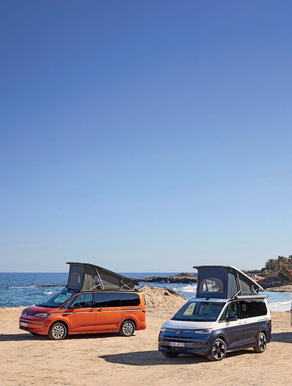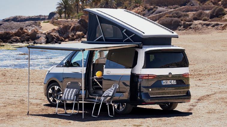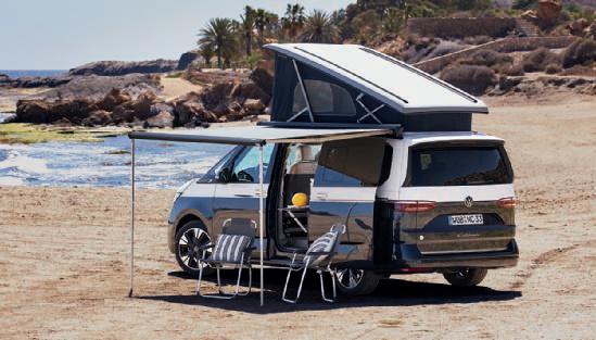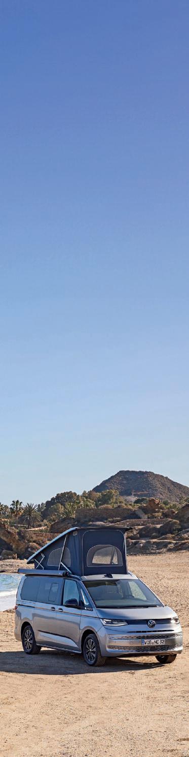 dieser nämlich zum Allrad, während der 1,5 TSI seine Kraft zur Vorderachse leitet, kommt hinten ein Elektromotor zum Einsatz, der den New California auch vollelektrisch bewegen kann. Wie weit, hat VW Nutzfahrzeuge allerdings noch nicht verraten. Fix ist eine Anhängelast von 2.000 Kilogramm. Mit Juni soll der neue California bestellbar sein, dann werden natürlich auch die Preise feststehen. Die ersten Kundenauslieferungen sind dann für das zweite Halbjahr 2024 geplant. •
