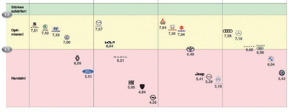 Und was im Vorfeld der für Frühjahr 2023 geplan ten Einführung des Agentursystems bei den Stel lantis-Marken abgeht, tut auch Außenstehenden weh. Die 6 hier bewerteten Marken klassierten sich geschlossen unter den letzten 7 der Geamtwertung. Unter den 10 am schlechtesten bewerteten Fragen über alle Marken sind ausschließlich Opel (5), Jeep und Peugeot (je 2) sowie Fiat (1) zu finden – mit Be wertungen, dass es einem schlecht werden könnte (zwischen 1,13 und 2,31 auf der Skala von 0 bis 10). Mehr darüber lesen Sie gegen Ende dieses Heftes.