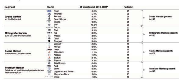 Je nach Marktanteil und Zahl der Standorte des jeweiligen Herstellers wurden zwischen 15 und 25 Markenhändler und -werkstätten befragt.