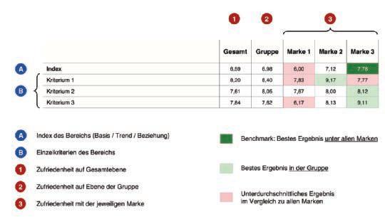 Dunkelgrün heißt: bestes Ergebnis unter allen 25 Marken, Hellgrün = Bester in der Gruppe; Rot zeigt unterdurchschnitt liches Abschneiden unter allen 25.