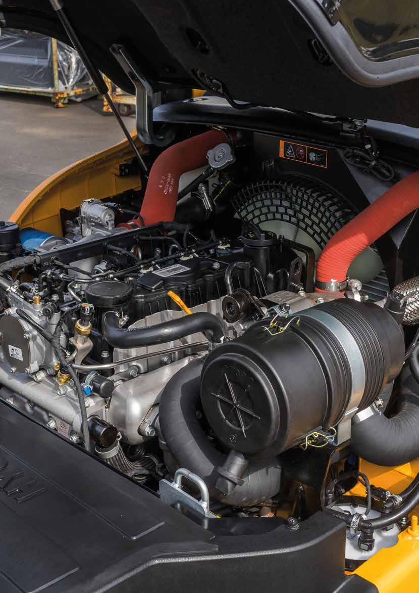 • Featuring the optimal displacement for a forklift, the HMC D4HB engine comprises a timing chain, an electronic EGR valve, a common rail, turbocharger with an excellent boosting effect and an exhaust gas after-treatment (DOC + DPF) device.