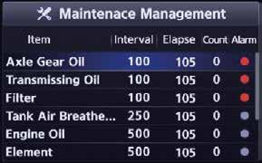 Engine and transmission failure codes can be checked in the cluster with no need for a separate diagnostic tool Replacement timing for consumable parts is set in the cluster and informs the operator on the screen from 30h before scheduled maintenance service on the screen.