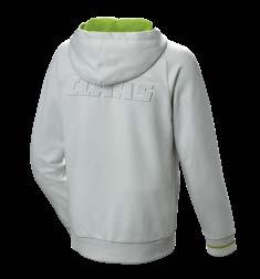 Kapucni világosszürke melange színben, kapucni zöld belül, nagy gépi nyomtatás az elején, hátul nagy CLAAS logó, 65% pamut, 35% poliészter, mosógépben mosható.