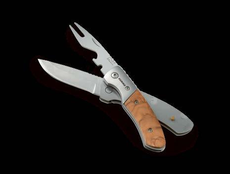 Rozsdamentes acélból és olajfából készült, hossza összecsukva: 9 cm penge hossza 6,5 cm.