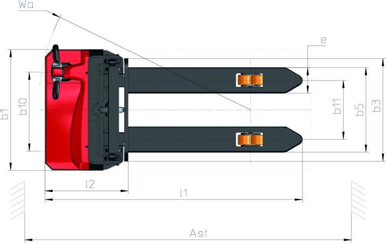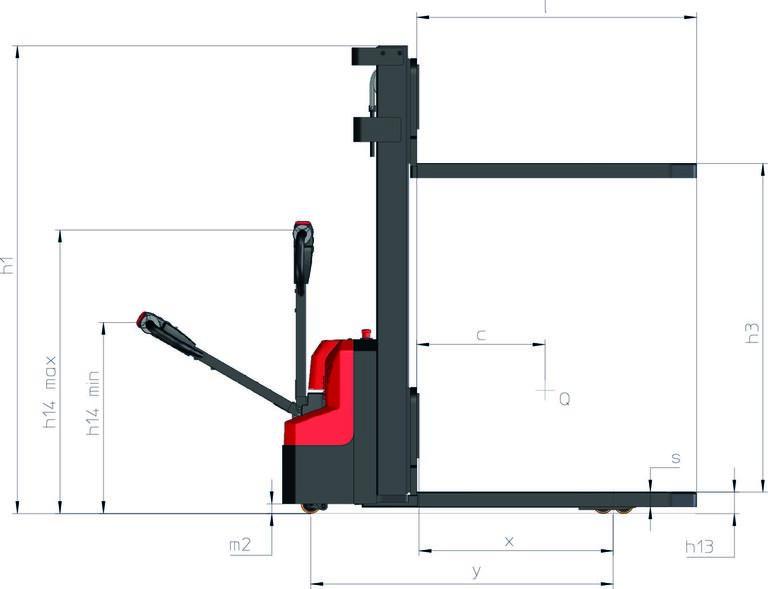 Technical characteristics Metric 1 1 Manufacturer MANITOU 1 2 Model Name ES 112 Easy 1 3 Power source Battery 1 4 Operator type Companion 1 5 Max capacity Q 1200 kg 1 6 Load centre of gravity c 600 mm 1 8 Distance from Load backrest to center of rear axle x 795 mm 1 9 Wheelbase y 1188 mm Weight 2 1 Service weight 610 kg 2 2 Weight on front axle (laden) / rear axle (laden) 645 kg / 1165 kg 2 3 Weight on front axle (Unladen) / rear axle (Unladen) 448 kg / 162 kg Wheels 3 1 Tyres type Polyurethane 3 3 Number of load wheels / Size of load wheels 4 / 80x64 3 4 Number of stabilizer wheels / Size of the stabilizer wheels 1 / 80x64 3 5 Number of front wheels / rear wheels 2 / 4 3 5 2 Number of drive wheels / Size of drive wheels 1/210x70 3 6 Front wheel gauge b10 566 mm 3 7 Rear wheel gauge b11 396 mm Dimensions 4 15 Fork height in low position h13 85 mm 4 19 Overall length l1 1698 mm 4 20 Length to face of forks l2 555 mm 4 21 Overall width b1 800 mm 4 22 Forks section / width / length s / e / l 60 mm / 170 mm / 1150 mm 4 24 Fork carriage width b3 680 mm 4 31 Ground clearance below mast m1 26 mm 4 32 Ground clearance at centre of wheelbase m2 26 mm 4 33 Aisle Width for pallets 1000 x 1200 crossways Ast 2226 mm 4 34 Aisle width for 800 x 1200 pallet lengthways Ast 2161 mm 4 35 Turning radius Wa 1392 mm Performances 5 1 Travel speed (laden / unladen) 4 20 km/h / 4 50 km/h 5 2 Lifting speed (laden / unladen) 0 11 m/s / 0 15 m/s 5 3 Lowering speed (laden / unladen) 0 12 m/s / 0 12 m/s 5 8 Max Gradeability (laden / unladen) 6 % / 10 % 5 10 Service brake Electro magnetic Engine 6 1 Drive motor rating S2 60 min 0 65 kW 6 2 Lift motor rating at S3 15% 2 20 kW 6 4 Battery / Battery capacity 24 V / 60 Ah 6 5 Battery weight (+/- 5%) 18 kg Miscellaneous 8 1 Type of drive control DC 8 4 Sound level at the driver's ear according to DIN 12 053 65 dB