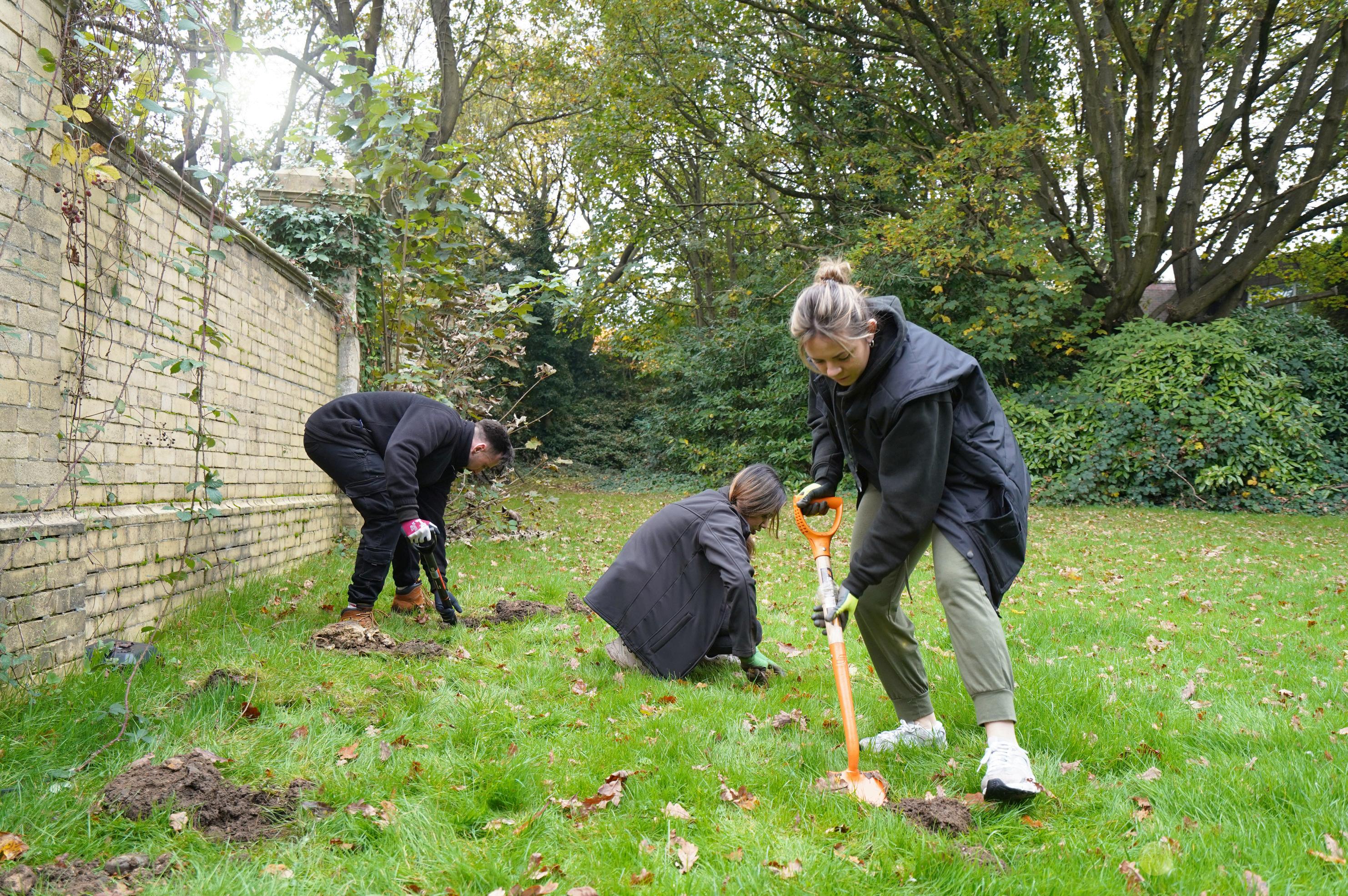 Axis volunteers transformed Garrick Close’s garden with Notting Hill Genesis and residents, planting 2,000+ bulbs and donating£6,000tobuytoolsandplantersto supportbiodiversity.