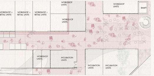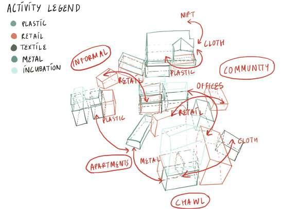 The development followed the nonlinear approach and the forming of networks - of green spaces, public spaces and linkages of inter-hub nodes. The re-purposing has been considered on site for the largest consumables for the area - Plastic, Metal and Cloth- which further aid collaboration.