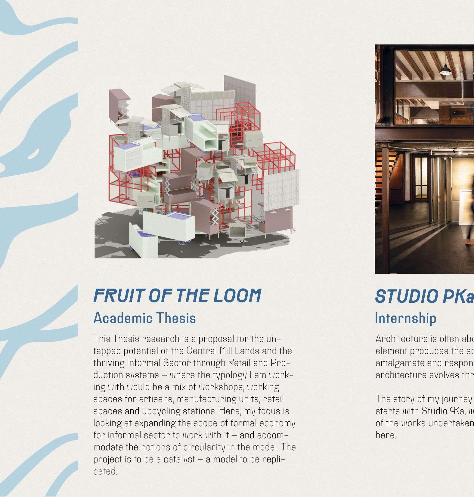 This Graduation Thesis Project deals with the inquiry of imagining the Mills as a center of production thus making a model for the re-purposing loop at the Heart of Mumbai. The layers tackled are the collaboration with NIFT, making the node a Green Lung, and the expansion in terms of Informality integrated in the project