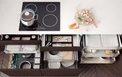 Tan importante como distribuir la cocina correctamente es organizar los interiores de armarios de forma racional. La cocina moderna es sinónimo de una planificación eficiente de los elementos que se guardan en ella, tanto objetos de menaje, como productos de alimentación o de limpieza. Al decidirse por el tipo de módulos altos y bajos, cajones y armarios dispensarios, es aconsejable meditar a qué se destina cada uno de ellos y complementarlos con unos interiores mimados al detalle. El sentido común dicta poner los objetos de uso más frecuente en los estantes que queden más a la vista y al alcance de la mano; los más pesados, en los armarios inferiores, y los utensilios que se usan sólo de forma esporádica, en los más alejados.