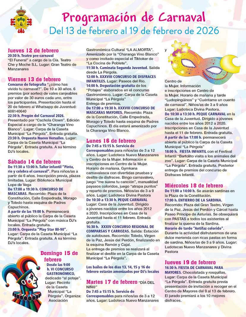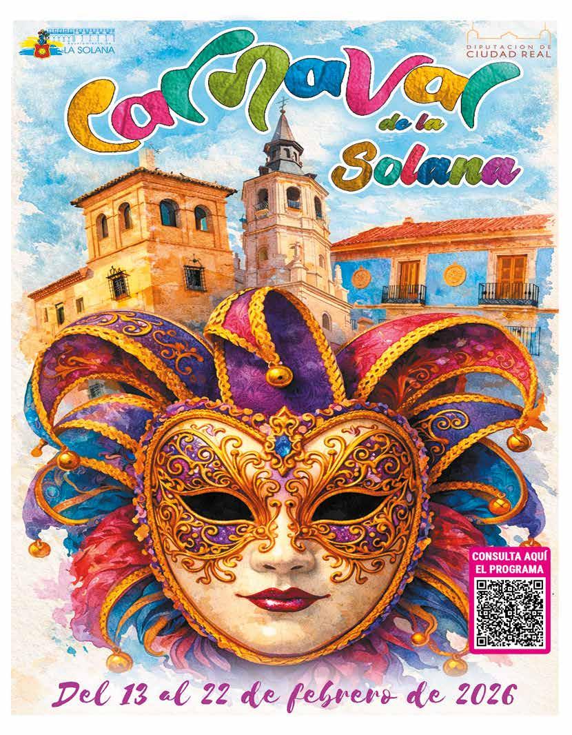 El popular humorista manchego, Agustín Durán, será el pregonero del siempre multitudinario y singular carnaval solanera. En cuanto a la figura de Carnavalero, se decidió proclamar a Pepa Román Bueno, de la Peña 8+1, en reconocimiento a su vinculación y participación activa en el carnaval local a lo largo de los años. Recogerá el testigo de manos de la anterior Carnavalera, Paqui Delgado, la noche del 13 de febrero en la carpa que, nuevamente, se instalará en la Plaza Mayor. Los tradicionales concursos gastronómicos -moje vendimiador y gachas- se celebrarán en la caseta municipal, en lugar de la Plaza Mayor y Plaza Don Diego. La decisión responde al objetivo de preservar el entorno urbano y ofrecer mayor comodidad tanto a participantes como al público asistente. Asimismo, la entrega de premios de estos concursos se realizará una vez finalizada cada prueba, agilizando el desarrollo del programa.