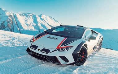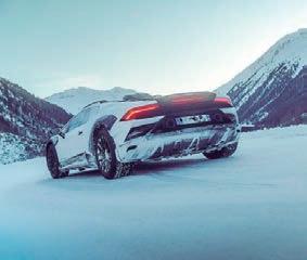 ron que la nieve no fuera un problema, y los neumáticos Bridgestone Dueler AT002 run-flat del Sterrato, especialmente adaptados al todoterreno Huracán y homologados para su velocidad máxima de 260 km/h, garantizaron el máximo rendimiento en condiciones invernales. Los bajos delanteros de aluminio, los umbrales y el difusor trasero reforzados y los pasos de rueda mejorados protegieron al Sterrato de los obstáculos helados y acentuaron su poderosa musculatura en el desafiante entorno de los deportes de invierno.