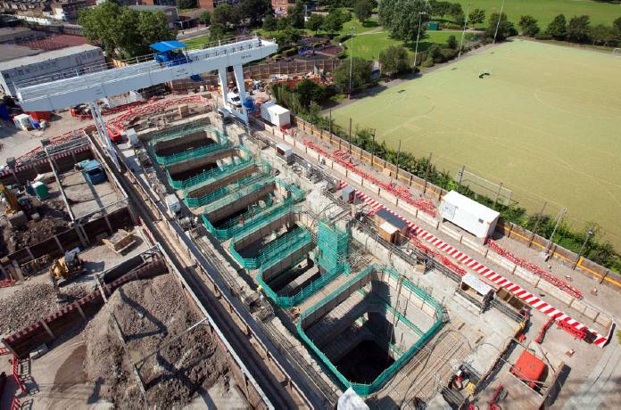 The new Crossrail line in London divides at Stepney Green, with one line continuing north and one line crossing the Thames to the south. A deep shaft and large mined cavern was required at this location as TBM reception and launch and to accommodate the converging tunnels. The shaft was constructed using deep diaphragm walling techniques. The tunnel crosspassages are some of the largest ever constructed using sprayed concrete lining, being 50m long, 17m wide and 15m high.