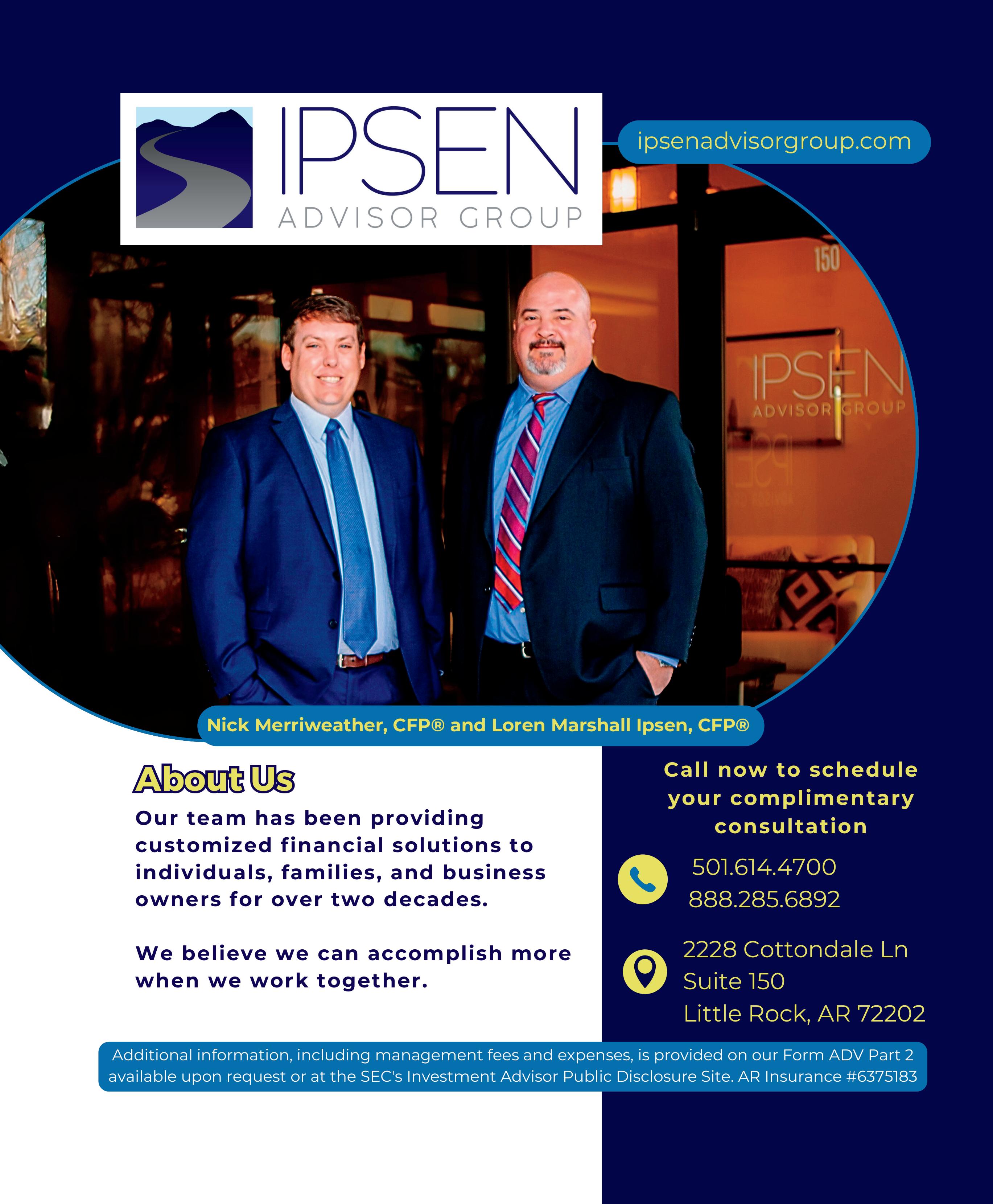 6 ARMONEYANDPOLITICS.COM SEPTEMBER 2023 AMP magazine is published monthly, Volume VI, Issue 5 AMP magazine (ISSN 2162-7754) is published monthly by AY Media Group, 910 W. Second St., Suite 200, Little Rock, AR 72201. Periodicals postage paid at Little Rock, AR, and additional mailing offices. Postmaster: Send address changes to AMP, 910 W. Second St., Suite 200, Little Rock, AR 72201. Subscription Inquiries: Subscription rate is $28 for one year (12 issues). Single issues are available upon request for $5. For subscriptions, inquiries or address changes, call 501-244-9700. The contents of AMP are copyrighted, and material contained herein may not be copied or reproduced in any manner without the written permission of the publisher. Articles in AMP should not be considered specific advice, as individual circumstances vary. Products and services advertised in the magazine are not necessarily endorsed by AMP. Please recycle this magazine.