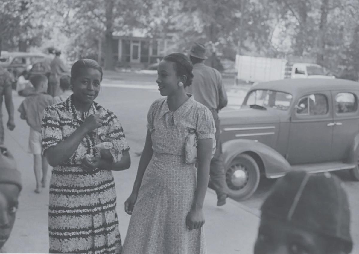 Two women talking on sidewalk, Wilson, Ark., circa 1938-1942