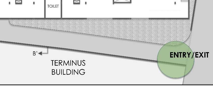 Site Massing Option 4: Keeping the Exhibition space same, and making a separate entrance pavilion for users to gather & then disperse into Exhibition and Experience Centre. Planned seating space, loading/unloading of raw materials, kitchen space, circulation and service areas too. Connecting lobby space within the structure. Multiple cores for easy accessibility. The space in between the 2 structures act as the publicplazawhichthenconnectstotheentrance pavilion and also to the Urban park.