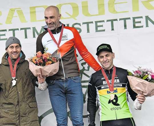 Mit Sven Fürst (im Meistertrikot) und Gabor Michel (unten rechts) standen bei den Masters zwei Fahrer der IG Radquer Mettmenstetten auf dem Siegertreppchen.