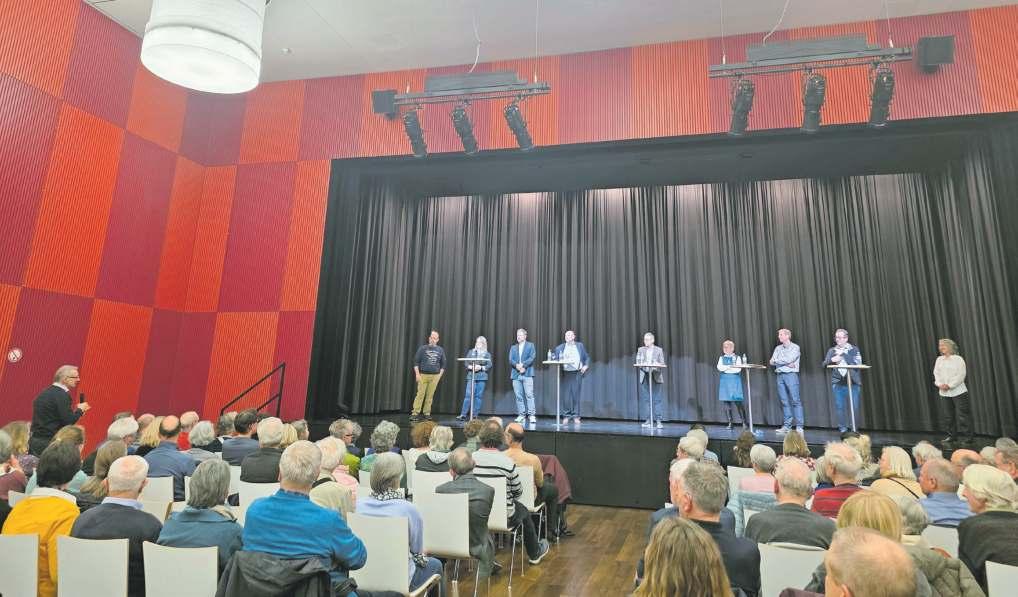 Mit der Stoppuhr in der Hand Aber auch mit den verbleibenden acht Personen war das Podium auf der Bühne im Kasinosaal gut gefüllt. An mehreren Stehtischchen reihten sich die Kandidatinnen und Kandidaten auf, bereit, sich den Anweisungen des Moderators Bernhard Schneider zu fügen. Der führte mit freundlich-eiserner Hand und praktisch mit der Stoppuhr durch den Abend und sagte, er freue sich auf harte Diskussionen – die es dann auch gab. Die Begrüs-