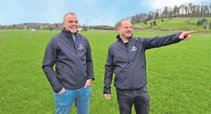 Mirco Kurt und Roman Nägeli beim Medientermin auf dem künftigen Festgelände. (Bild zvg)