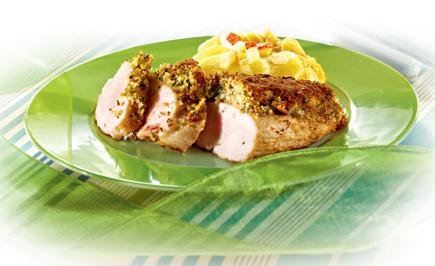 3. Die Krustenmasse auf die Pouletbrüstli streichen und im Ofen gratinieren. – Zubereitung ca. 40 Min.