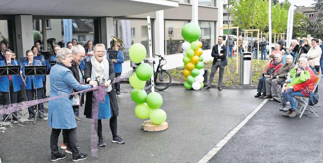 Das Durchschneiden des Bandes führte die Stadtpräsidentin zusammen mit Stadträtin Eliane Studer Kilchenmann und Bewohner Ernst Spiess durch Nach dem grossen, herzlichen Applaus strömten die Gäste in das neue Haus und begaben sich auf einen Rundgang An diesem Tag standen ihnen die Türen fast im ganzen Haus offen In den kommenden Wochen findet die grosse Züglete statt Die Bewohnerinnen und Bewohner werden in die neuen Räumlichkeiten einziehen und sie zu ihrem neuen Zuhause machen.