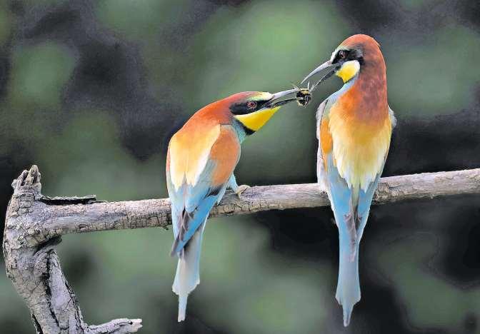 Bienenfresser gehören zu den farbenprächtigsten Vögeln der Schweiz Hier bei der Übergabe des Brautgeschenks. Männchen und Weibchen sind vom Aussehen her nicht unterscheidbar Bild rechts: Die Haubentaucher, man kann sie im Frühjahr bei ihrer einzigartigen Balz an den Seen beobachten. Ihr Backenbart und ihre Federohren machen sie einzigartig.