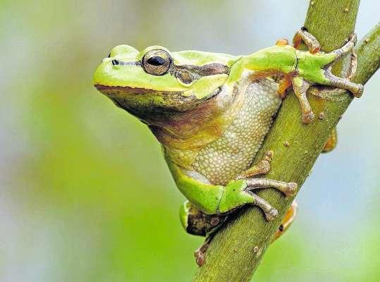 Ab und zu hört man die Laubfrösche im Spätsommer und bis in den Herbst aus Hecken und Gebüschen rufen. Der Laubfrosch kann auch sehr gut klettern.