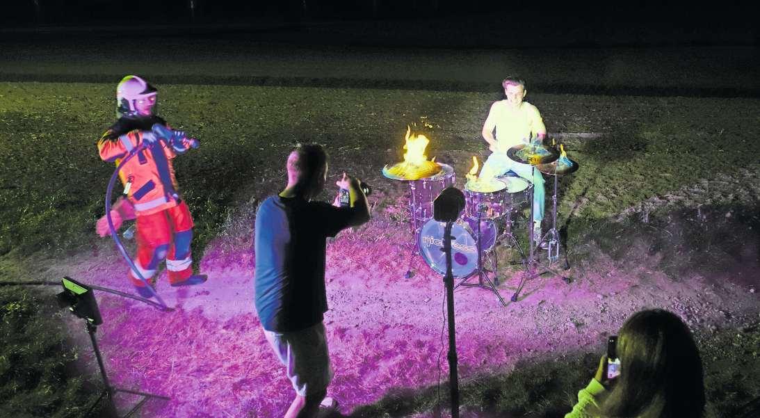 Der Zürcher Musiker Nickless drehte vergangenen Sonntagabend in Affoltern ein neues Musik-Video. Sein Schlagzeug –also Teile davon – standen geplant in Flammen und wurden dann von der Stützpunktfeuerwehr Affoltern gelöscht Die Aktion liess den Hauptdarsteller klitschnass zurück. (red) Seite 11 Bild