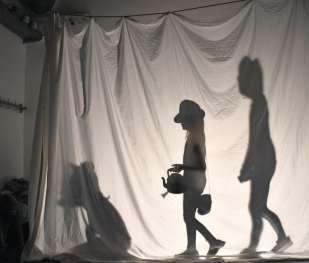 Basil. Er spielt mit seinen acht wilden Piraten Fakiren die am Vortag bespro chene Geschichte durch Beim wilden Gefuchtel mit einem Messer wird ein Arm halb durchtrennt aber alles nur Show In einer Garderobe im unteren Bereich der Halle werden gerade einzel ne Elemente eines Schattentheaters aus probiert.