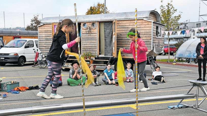 «Die Infrastruktur mit der Dreifach sporthalle und dem Areal ist ideal», erklärt OK Chefin Corinne Klein Organisiert wird die Zirkuswoche vom Familienclub Wettswil Bonstetten Über Hundert Primarschüler aus den beiden Gemeinden konnten sich einen begehr ten Platz ergattern Für die Zirkus aktivitäten ist das Team von Pipistrello verantwortlich Der Ablauf und die Vorführungen werden aber durch die Kinder selbst bestimmt Draussen auf dem Areal sind die Seiltänzerinnen am Üben, auf Fässern wird balanciert und auch die Clowns bereiten sich auf ihre
