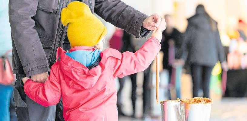 Spass. Sobald die Kerze die gewünschte Dicke erreicht hat, kann sie am Schneidetisch gratis verziert werden. Hier entstehen die kreativsten Formen, und es gibt keine Grenzen. Wachsrosen oder Ringe verleihen den Kerzen ein einzigartiges Aussehen. Diese selbst gemachten Unikate sind das perfekte Weihnachtsgeschenk. Nach dem langen Stehen in der kühlen Luft wartet in der Kaffeestube ein Leckerbissen auf Besucher, und es werden diverse warme Getränke angeboten.