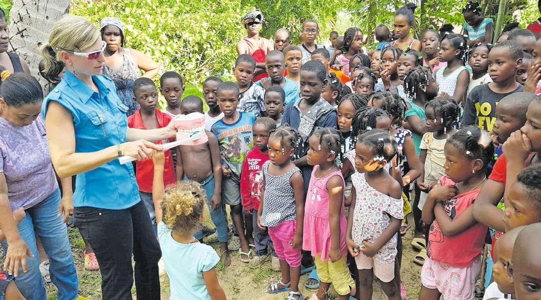 Die diesjährigen Einsätze waren für Daniela Frey ganz besonders. Erstmals begleitete sie ihre dreijährige Tochter «Mir war wichtig, dass sie lernt, dass es ‹da draussen› auch ‹andere Welten› gibt» sagt die Dentalhygienikerin «dass die Kinder in der Karibik nicht so viele Dinge besitzen, wie wir hierzulande » Die Kleine half mit bei den Instruktio nen der korrekten Putztechnik am Mo dell und beim Verteilen der Hilfsgüter Die Schattenseite der Reise war Hur rikan Fiona, welcher fünf Tage vor ihrer Ankunft übers Land wütete und teils massive Schäden anrichtete Teile der grossen Wassermengen bekam auch das