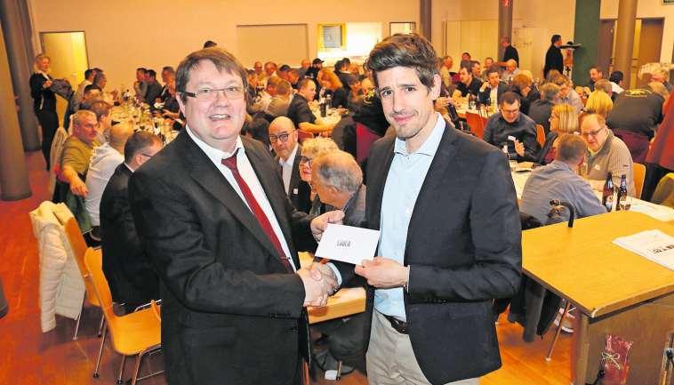 An der GV: Martin Schindelholz OK-Präsident der AGLAT gratuliert Marc Scherrer Präsident Gewerbeverein KMU Laufental zu seiner Wiederwahl als Landrat mit bestem Ergebnis im Bezirk Laufen