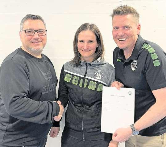 Sportchef Sandro Romeo (links) und Finanzchef Martin Hasenfratz bei der Vertragsunterzeichnung mit Ivana Müller-Ravlic. (Bild: ZVG)