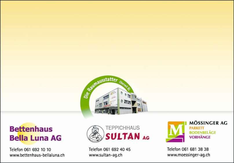 Impressum Oberbaselbieter Zeitung mit den Titeln «Gelter kinder Anzeiger» und «Waldenburger Anzeiger» ISSN 1661 6502 Amtliches Publikationsorgan des Kantons Basel Landschaft Auflage: 40 961 Exemplare (WEMF beglaubigt) Erscheint wöchentlich jeweils donnerstags Abonnement Fr 58 jährlich, Fr 31 halbjährlich www oberbaselbieterzeitung ch Herausgeberin CH Regionalmedien AG Redaktionsleitung Marc Schaffner Redaktion Marc Schaffner marc schaffner@chmedia ch Telefon 061 927 29 01 (Baselland Liestal) Brigitte Reinhard brigitte reinhard@chmedia ch Telefon 061 927 29 02 (Waldenburg Gelterkinden) Adresse/Sekretariat Oberbaselbieter Zeitung Rheinstrasse 3 Postfach 436 4410 Liestal Brigitte Reinhard brigitte reinhard@ chmedia ch Tel 061 927 29 02 Druck CH Media Print AG Inseratenverkauf AZ Anzeiger AG Rheinstrasse 3 Postfach 436, 4410 Liestal Telefon 061 927 26 70 Fax 061 927 29 30 inserate obz@chmedia ch Inseratenschluss: Montag 16 00 Uhr Todesanzeigen: Dienstag 10 00 Uhr Redaktionsschluss: Montag 10 00 Uhr Eine Publikation von www chmedia ch Anzeige