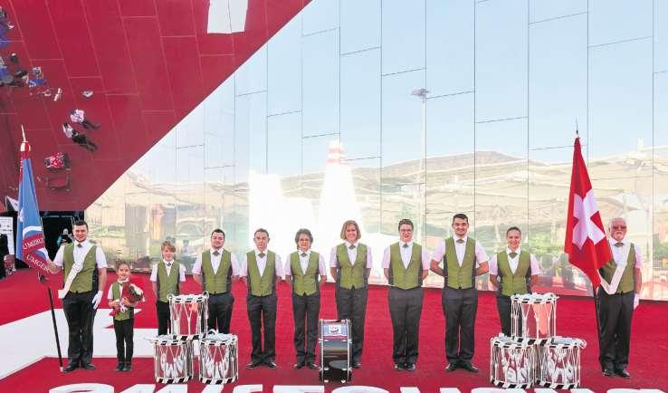 Die Wettinger Tambouren unter dem Schweizer Pavillon an der Expo Dubai zVg
