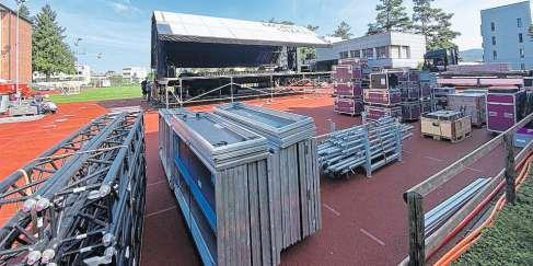 Die 200 Festfahnen hängen seit Ende Juli und am Montag nahmen Handwerker und Techniker das Zepter in die Hand Auf dem Sportplatz Boostock wurden die Hauptbühne und auf dem Festgelände Stände und Festbeizen aufgebaut. Mitten unter ihnen Brunnenmeister Milutin Mušić, der mit Viktor Ott für die Wasseranschlüsse der Beizer verantwortlich ist. (bär) S. 7