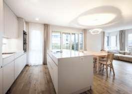 DieWand, dieeinst Kücheund Wohnbereich trennte, wurdedurch eine stilvolleKochinsel ersetzt, wodurcheineoffene, harmonische Verbindung zwischen Küche, Ess- undWohnbereich entsteht.Die neuenweissen Küchenmöbelin