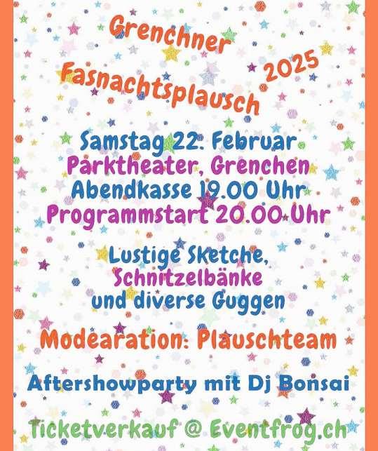 Freuen Sie sich auf ein festliches Programm voller Unterhaltung! Grenchner Fasnachtsplausch 2025 mit humorvollen Sketche. Lachnummern, Schnitzelbänken und diversen Guggen Aftershowparty mit DJ Bonsai Sichern Sie sich jetzt Ihre Tickets auf eventfrog.ch! Die Türen öffnen um 19 Uhr, und auch an der Abendkasse sind Tickets erhältlich.