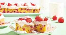 4. Für den Belag Rahm mit Zucker und Vanillezucker steif schlagen. Sauren Halbrahm unterziehen. Auf dem Kuchen verteilen Erdbeeren und Meringues daraufstreuen.