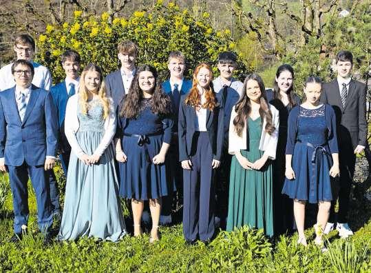 Jugendarbeiter Jakob Schneider und Pfarrer Raphael Hadorn mit den Konfirmanden Damien Minder Lina Ritter Pascal Thommen, Nora Stricker Janis Antonutti, Lea Oetiker, Florian Schmutz, Isabella Lestin Alicia Haas Jasmin Bont und Benjamin Bissig (v l.). Foto: zVg