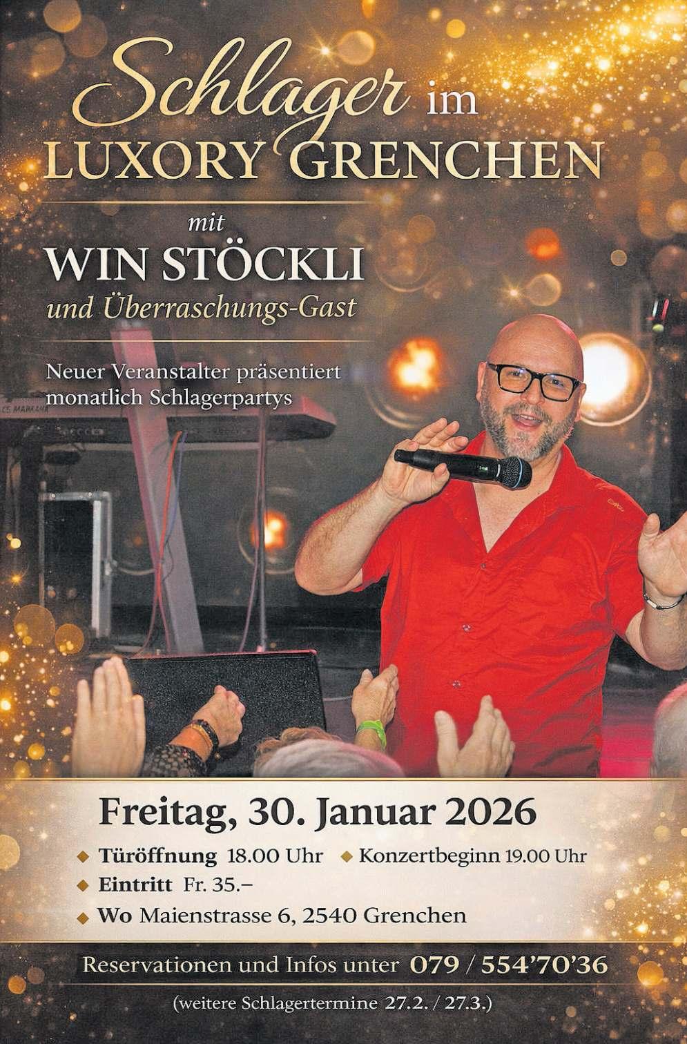 Den Start macht am 30. Januar ab 19 Uhr Win Stöckli. Der Aargauer Entertainer ist in Grenchen bestens bekannt, vermochte er doch in den letzten Jahren bereits mehrmals mit seinem riesigen Repertoire zu begeistern. Win Stöckli reisst sein Publikum von den Stühlen, überzeugt mit Schlagern, aber auch mit Rock’n’Roll oder Country. Tolle, vielseitige Tanz- und Partymusik, von Balladen bis zum Hüttenkracher, von Country bis Oberkrainer, von uralt bis modern und von gediegen bis ausgelassen präsentieren seine Gäste: Die Zulgtaler werden den ersten neuen Schlagerabend unvergessen machen. Reservation: 079 554 70 36.