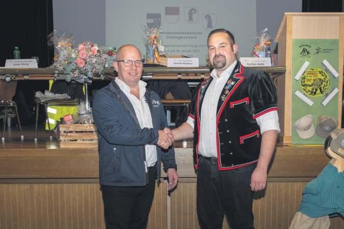 Der Verbandssitz bleibt im Kanton Solothurn. Michael Saner aus Laupersdorf, links, gratuliert seinem Nachfolger Patrick Waldner. Foto: zVg
