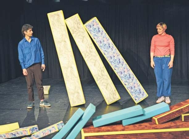 In einem Bühnensetting folgen die beiden Schauspieler einem Fall