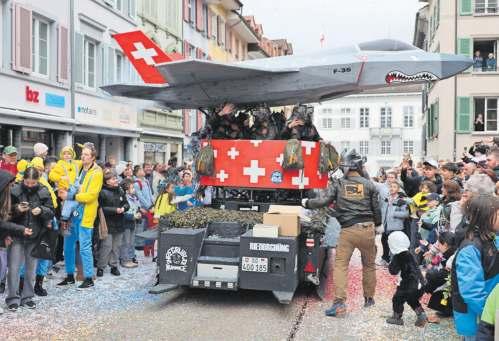 Das Dorfleben auf die Schippe In einem Hort der unbeschränkten Narrenfreiheit zeigte die Wagenkarawane mit ihren Sujets und Versen durch ein kurioses und gesellschaftskritisches Brennglas, was die Menschheit in Gelterkinden und in der Schweiz in diesem und in letztem Jahr so alles beschäftigt hat. Ausländische Themen musste man suchen. So wurde mit grossem Genuss und beissender Satire die Abstimmung über die SRG-Initiative von den «Räbhübel-Schlurgi» aus Böckten aufs Korn genommen: «Mä chönnt fascht sovill spare, wie mit halbe SRG-Gebühre, wenn mä bi dr Regierig in Bern, Leischtigslohn würd ifüehre». Die «Scheidegg-Rueche» aus Gelterkinden wie auch andere Grup-