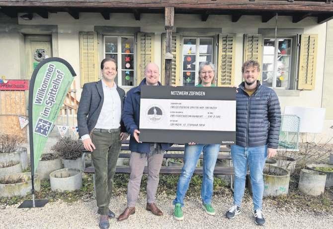 Simon Gerber, Vizepräsident Netzwerk Zofingen, Timo Henzmann, Präsident Netzwerk Zofingen, Seraina Combertaldi, Betriebsleiterin Spittelhof und Fabian Senn, Beisitzer Netzwerk Zofingen (v.l.) bei der symbolischen Checkübergabe. BILD: ZVG