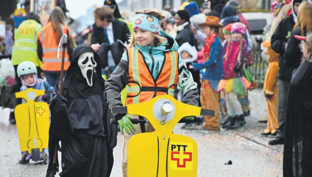 tete Jessi’s Buurehof Spielgruppe unter dem Motto «Biene» und der Gewerbeverein signalisierte mit seinem Auftritt, dass sich die Schweizerische Post keine Sorgen um den Nachwuchs machen muss. Auf als Post-Töffli umgestaltete Trottinetts flitzten etliche kleine Pöstlerinnen und Pöstler die Umzugsroute entlang und sorgten für den grossen Jö-Effekt. Dann plötzlich wähnte man sich in