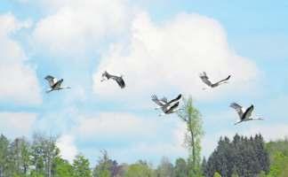 Imposant: Eine Gruppe von Weissstörchen im Flug.