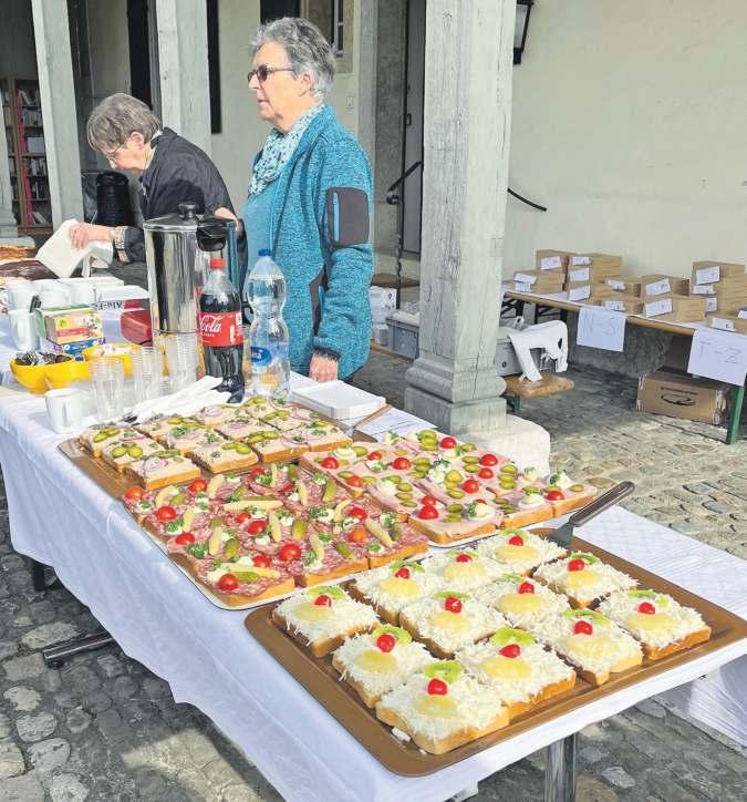 Belegte Brötli auf Vorbestellung Neben den Broten sind auch die beliebten belegten Brötli im Angebot. Diese können jeweils bis spätestens Montag vor dem Anlass vorbestellt werden (in diesem Jahr war es der 2. März). Angeboten werden Sorten mit Thon, Sellerie, Schinken und Ei. Das Brötliteam berechnet die benötigten Mengen genau, kauft die Zutaten ein und bereitet am Freitag und Samstag alles frisch zu. Rund zehn engagierte Frauen sind allein für die belegten Brötli im Einsatz. Ein kleines Dessert darf beim Backwarenverkauf natürlich auch nicht fehlen: Die Landfrauen bieten auch noch selbst gemachte Bretzeli und Schlüferli in liebevoll verpackten Säckli an.