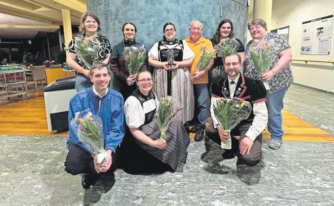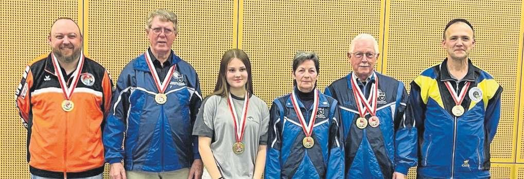 Die Bezirksmeister im sportlichen Schiessen standen im Mittelpunkt (v.l.): Bernhard Kayser, Gustav Hochuli, Julia Bichsel, Marianne Saxer, Heinz Sollberger und Peter Zürcher. BILD: RENÉ WULLSCHLEGER